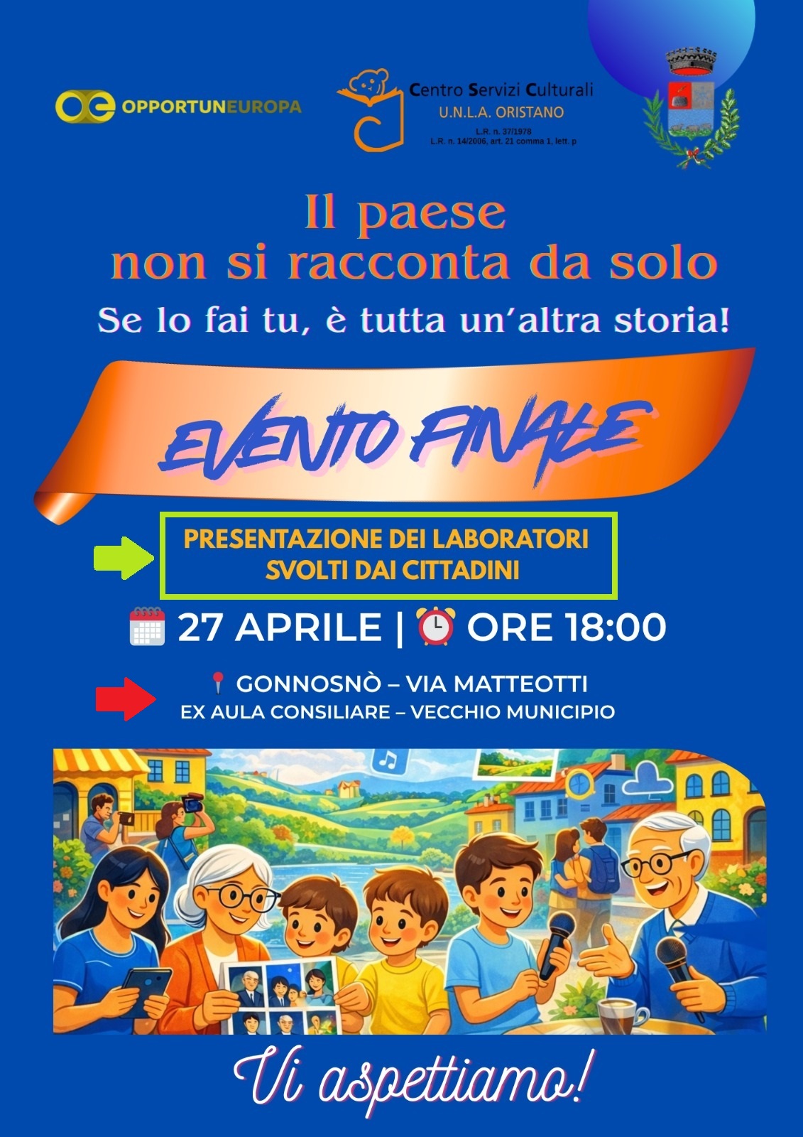 Lunedì 27 Aprile 2026, alle ore 18, presso la sala multimediale dell’ex municipio in via Matteotti, si terrà la presentazione e la proiezione del lavoro svolto in questi mesi da alcuni cittadini di Gonnosnò, che hanno raccontato il paese secondo i loro ricordi e il loro punto di vista!